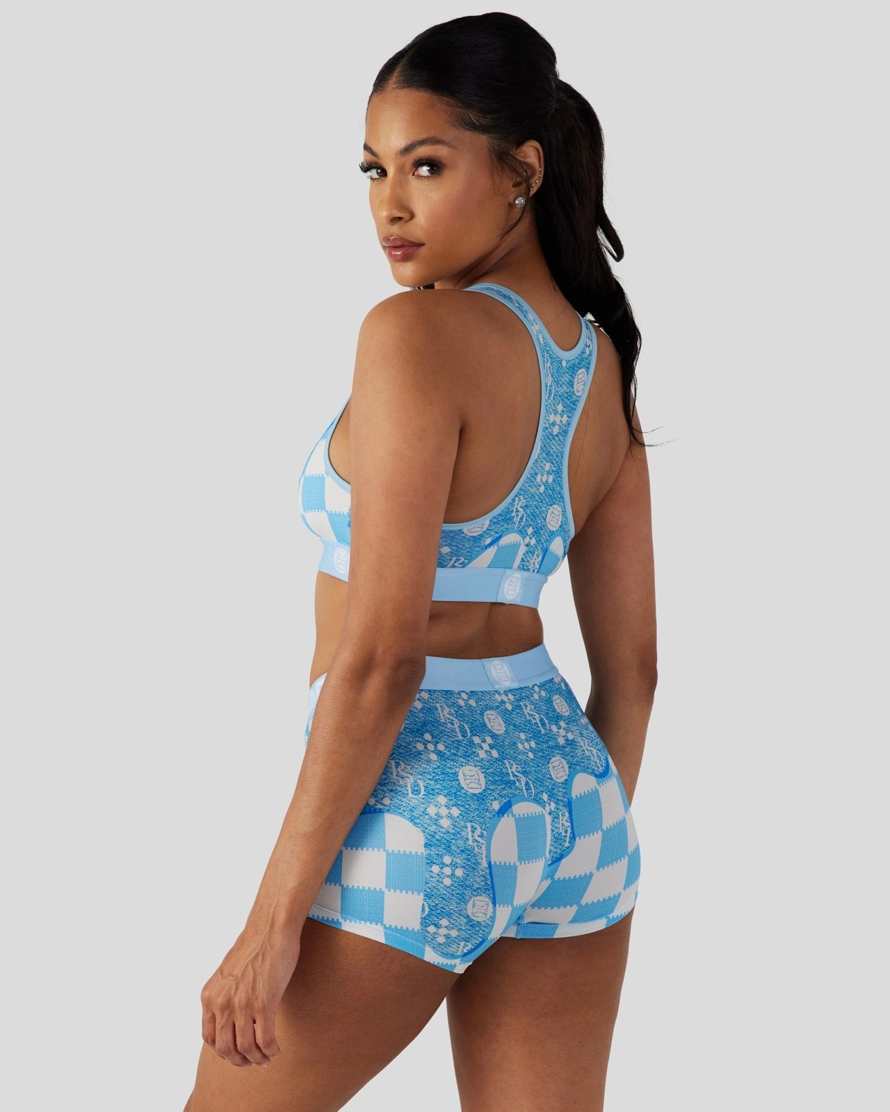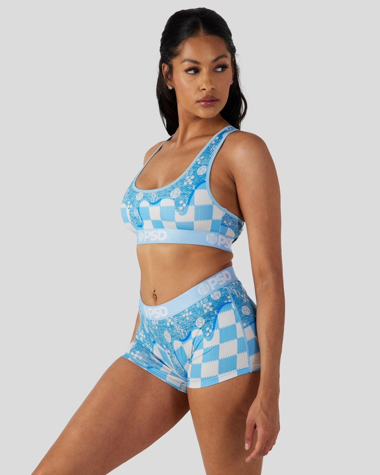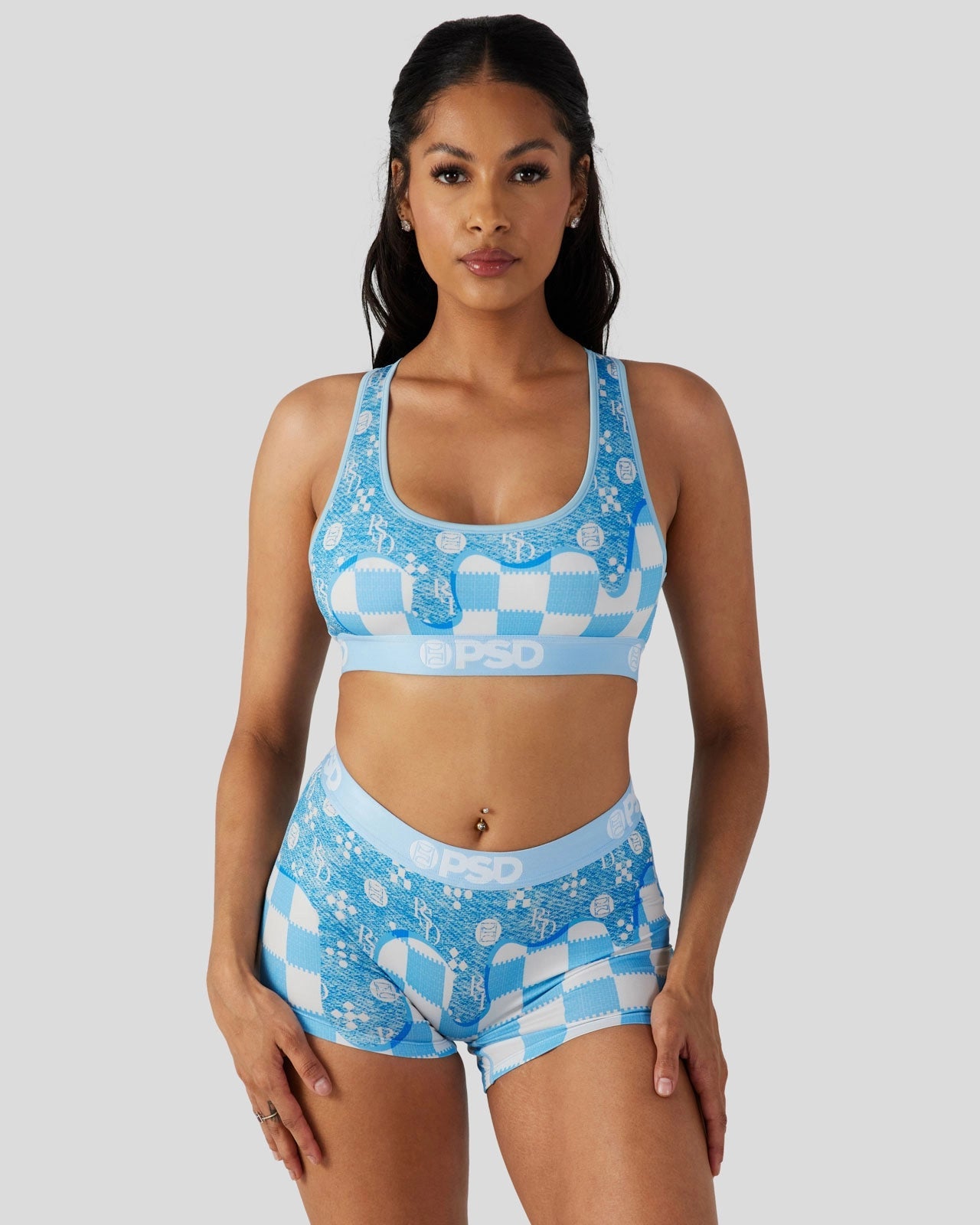 The Blue Denim Drip Sports Bra features a luxury-inspired print dripping onto blue and white checkers. Made from a silky poly blend. the PSD sports bra is breathable yet slightly compressive. bringing you the comfort and support you need for everything you get into. This style is available in sizes XS – 5XL.