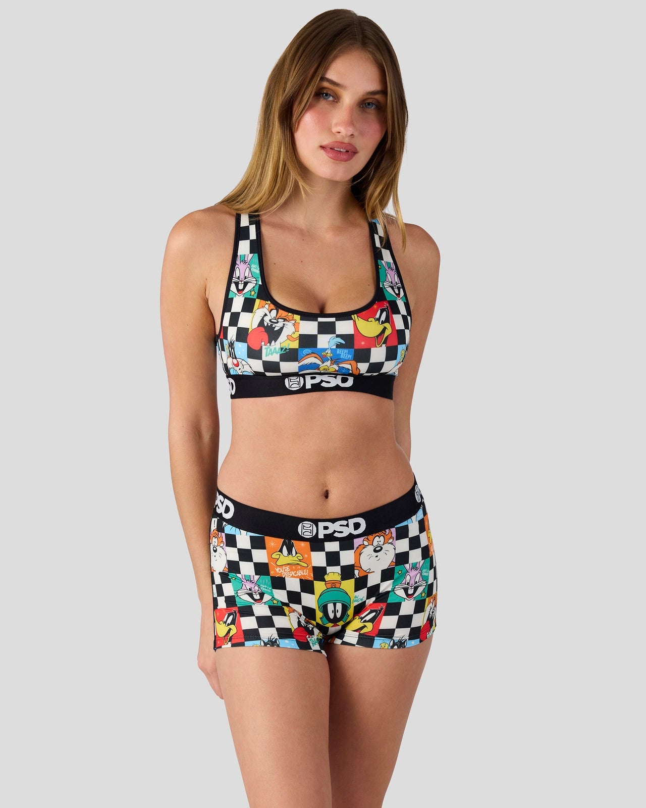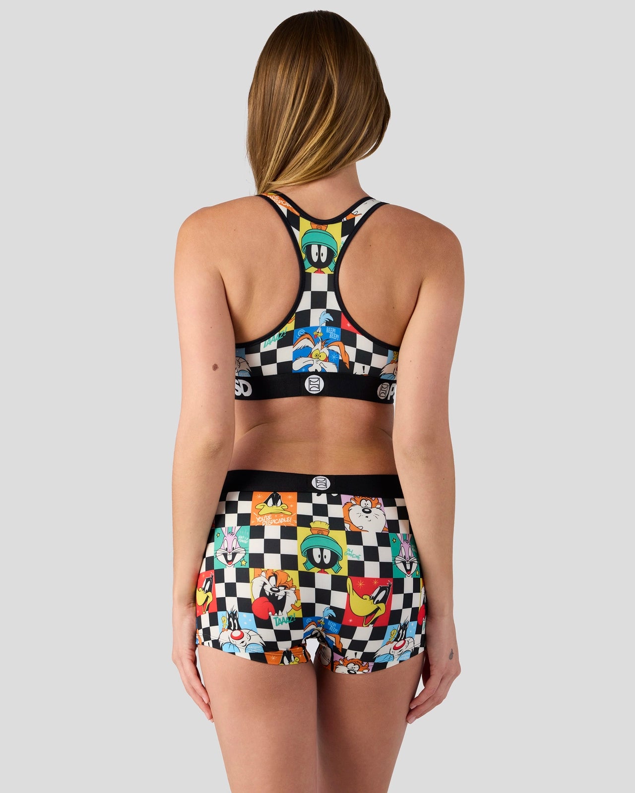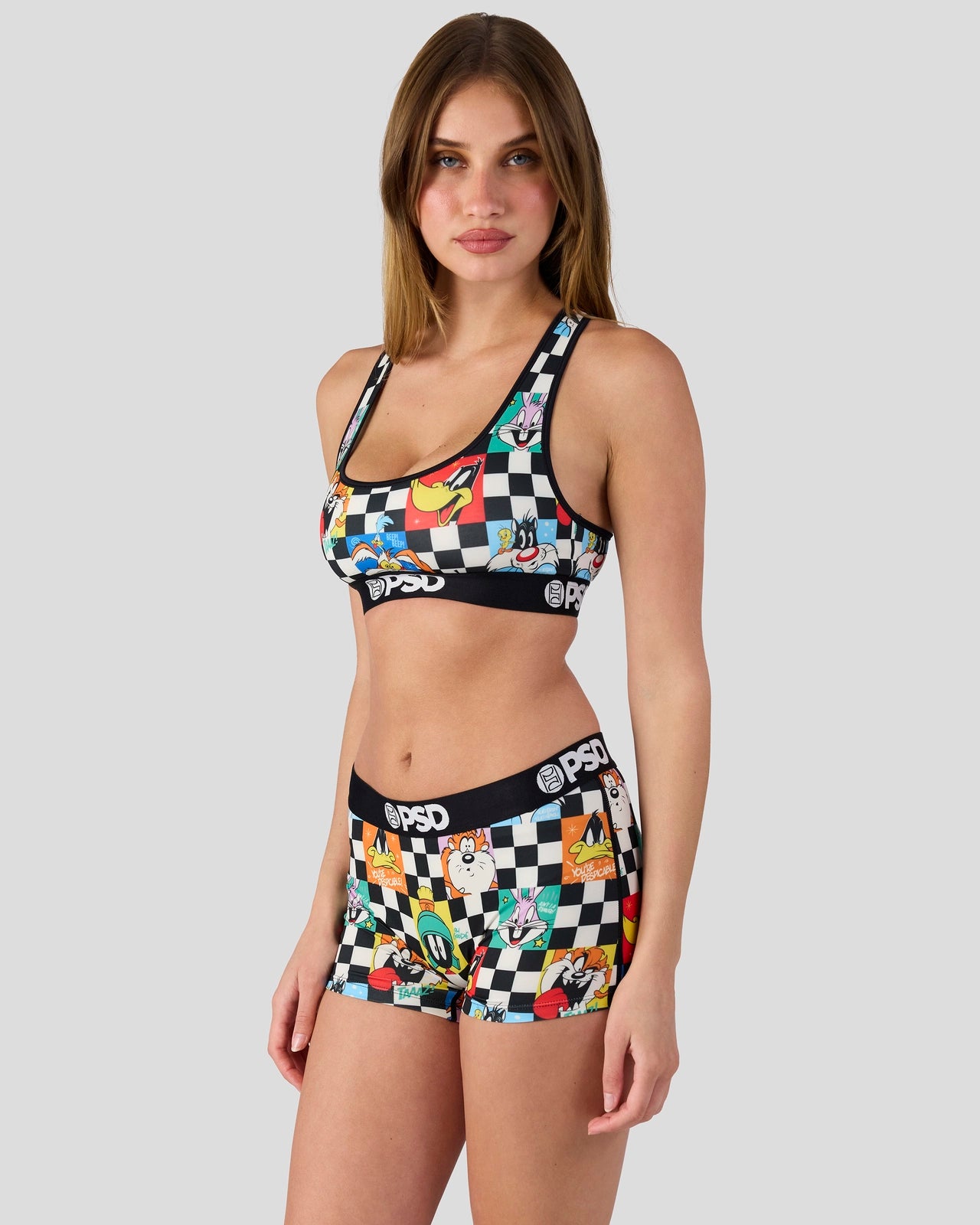 Featuring the whole Looney crew. the Check Sports Bra from Looney Tunes x PSD is made from a silky poly blend that’s breathable yet slightly compressive. bringing you the comfort and support you need for everything you get into.