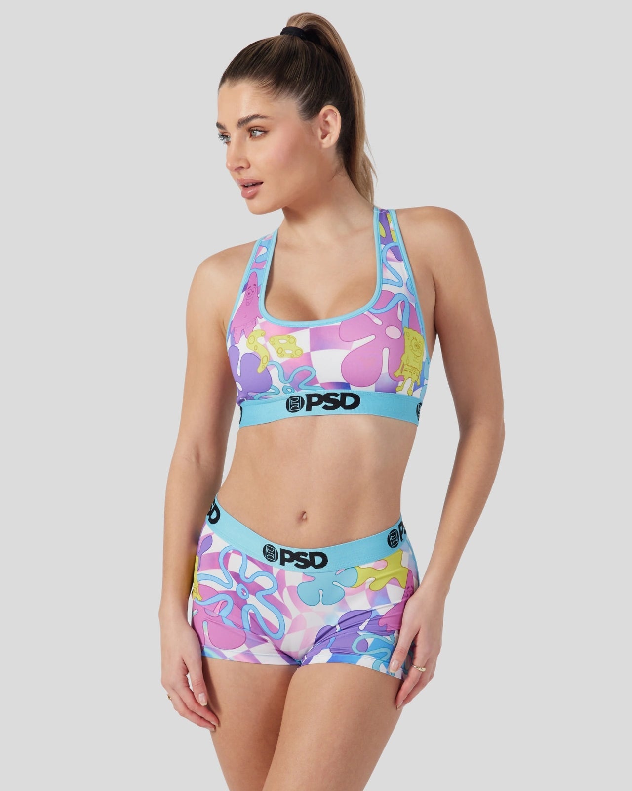 SpongeBob. Patrick. flowers. and checkers all in bright neon colors combine to create a new style you can’t miss. The SpongeBob SquarePants Neon Check Sports Bra is made from a silky poly blend and is breathable yet slightly compressive. bringing you the comfort and support you need for everything you get into.